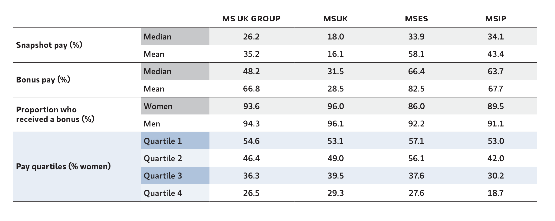 In this summary, we review the combined data of the three entities within the Morgan Stanley UK Group which provides a more balanced reflection of our total UK workforce and enables us to highlight trends.