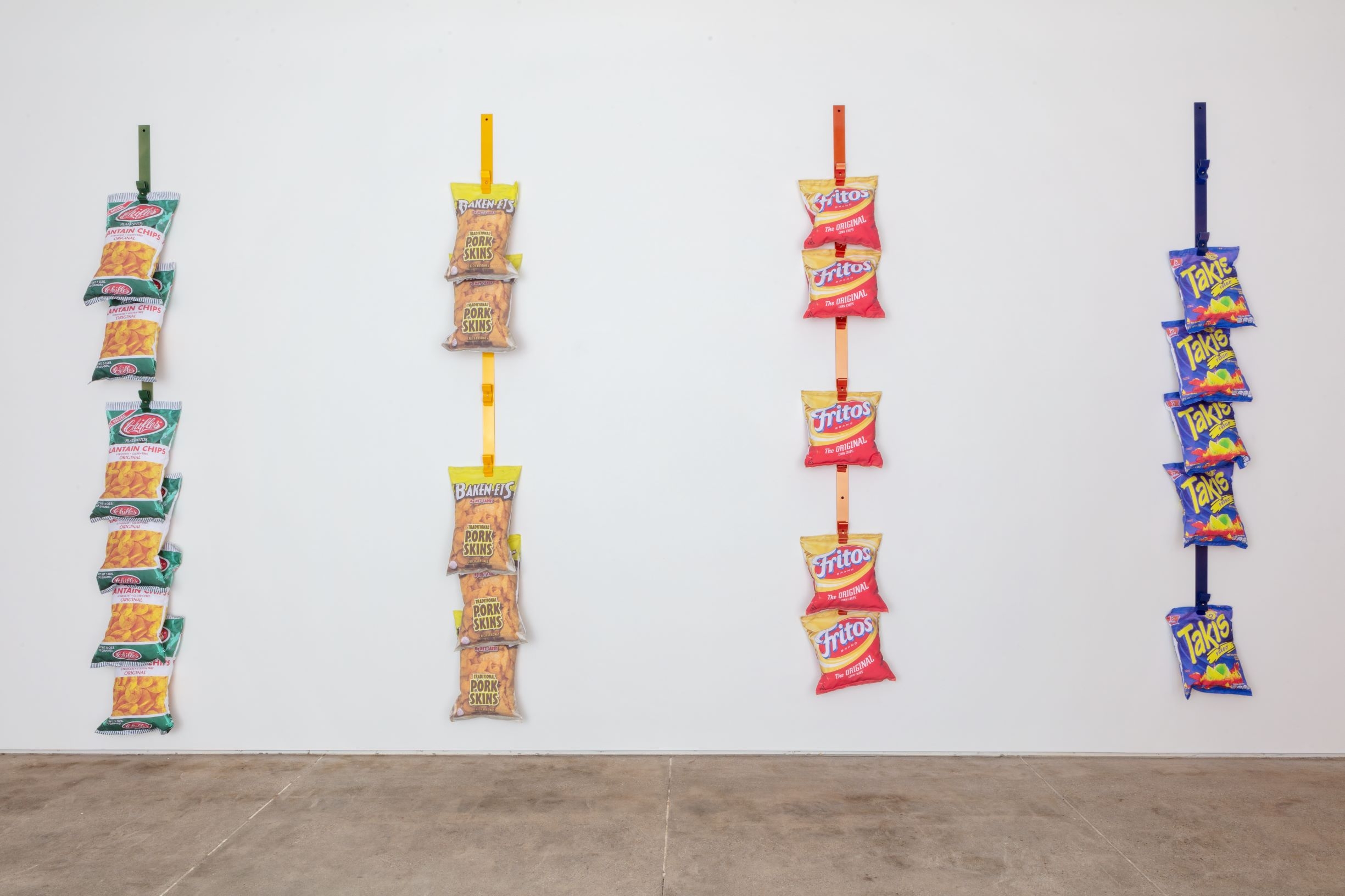 Lucia Hierro, Rack: Platanitos, 2019; Rack: Chicharrones, 2019; Rack: Corn Chips, 2019; Rack: Takis, 2019; digital print on brushed nylon, foam, and powder-coated aluminum