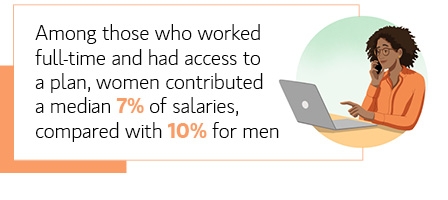 Women are more likely than men to be the primary family caregiver and take unpaid time off to care for their own children or relatives. This can lead them to leave the workforce, pause their careers or seek more flexible, part-time jobs that often don’t offer employee retirement savings plans. These pauses or shifts in career trajectory can reduce the total funds saved and accumulated in employer-sponsored retirement plans. And lower lifetime earnings may mean fewer opportunities to save for retirement as a whole.